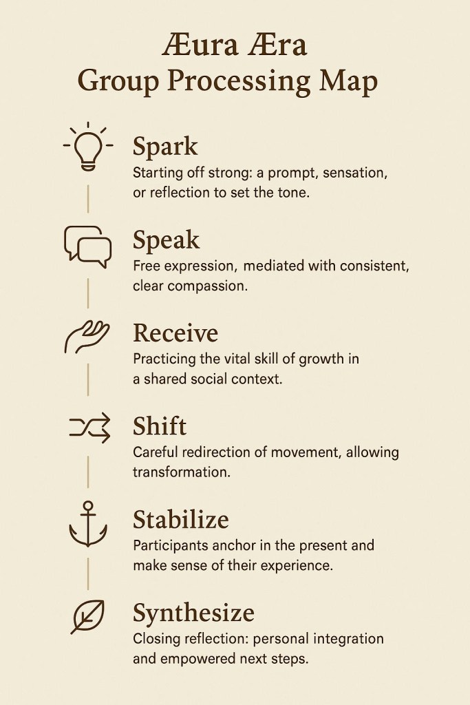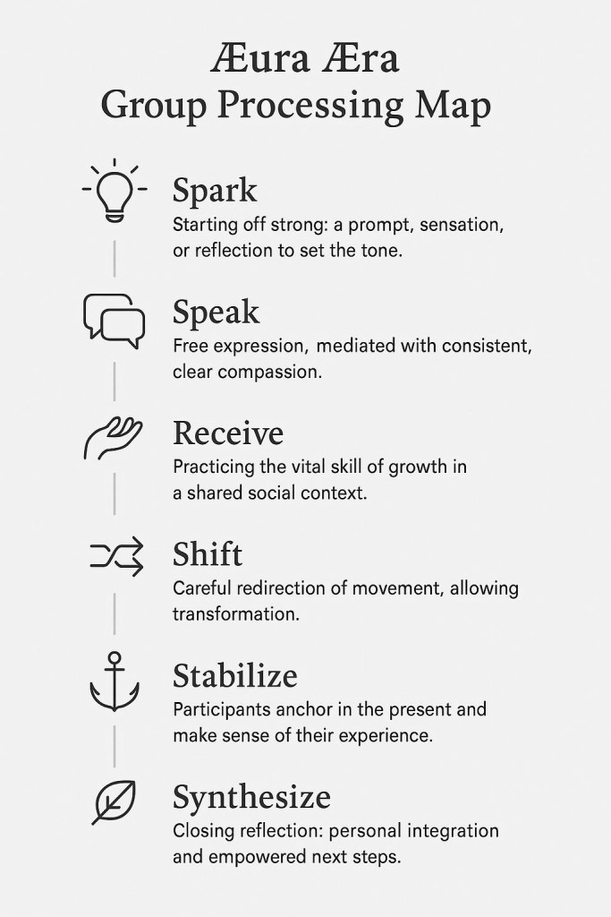 Each session follows the Æura Æra process arc and is anchored in the Quadratic Systemic™ model, creating a structured environment that supports psychological safety and catalytic clarity, balancing individual expansion with community cohesion.